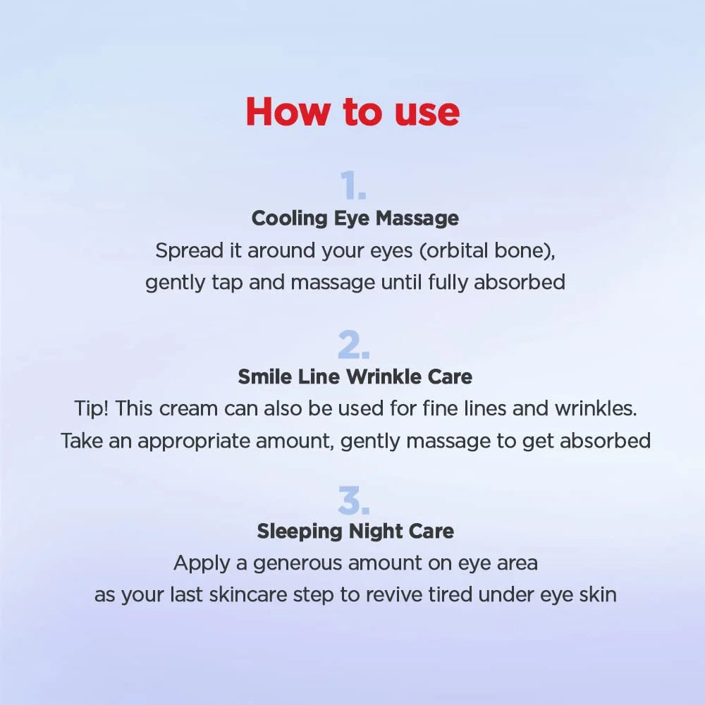 • How to use: At hte last step of your evening skincare routine, but before moisturizing, take an adequate amount and gently pat onto the areas around the eyes and other areas where wrinkles are a concern.